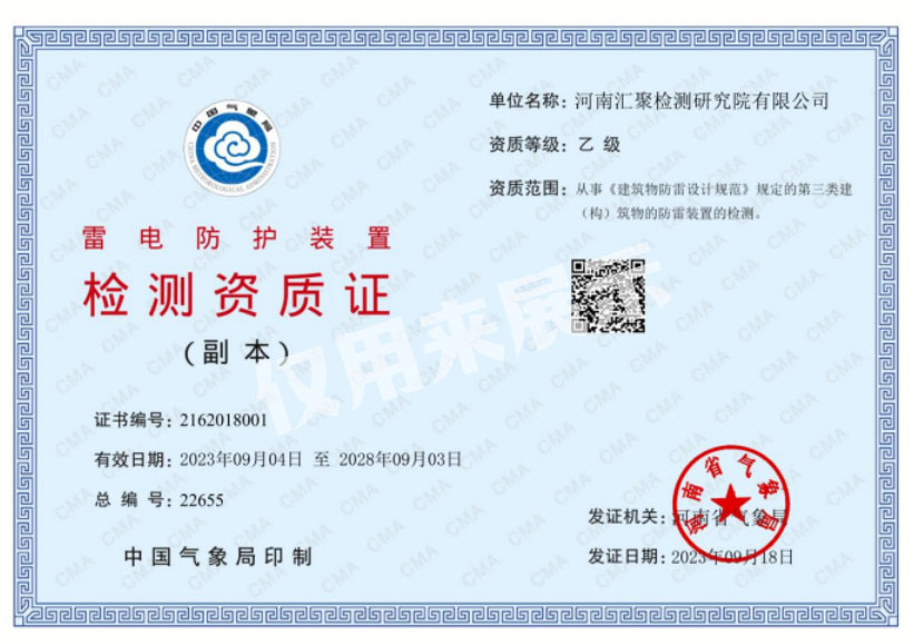 • 熱烈祝賀河南匯聚防雷檢測有限公司獲得CMA資質
